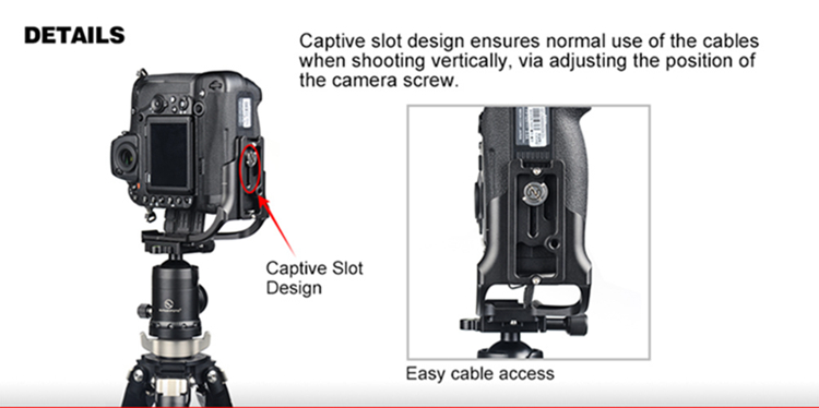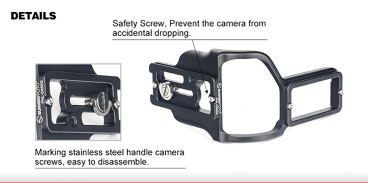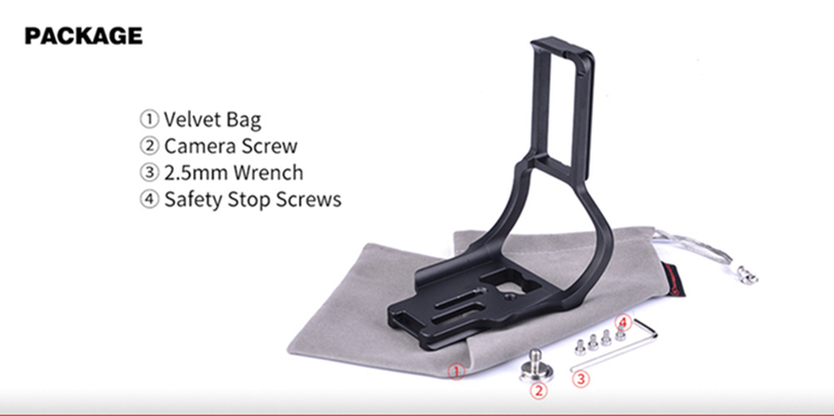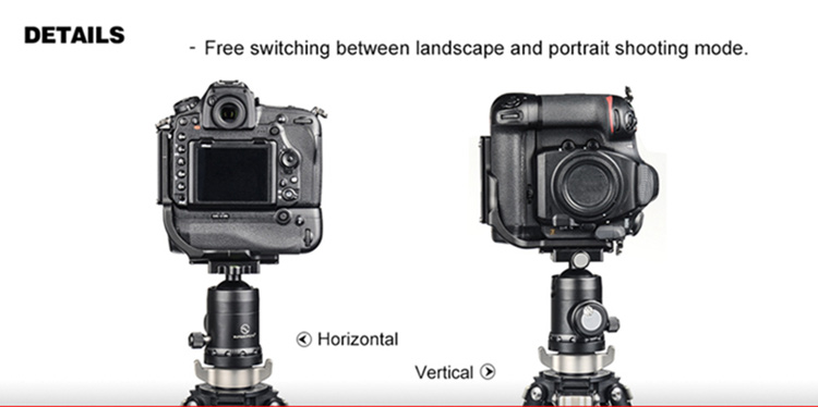 Using L bracket can maximize the stability and efficiency of using the camera on the ball head when switching the horizontal and vertical composition. Can completely eliminates the common gross positioning shifts in changing the horizontal composition to vertical composition, and the depth of the scenes catching in horizontal aspect will not be effected when changing the composition.