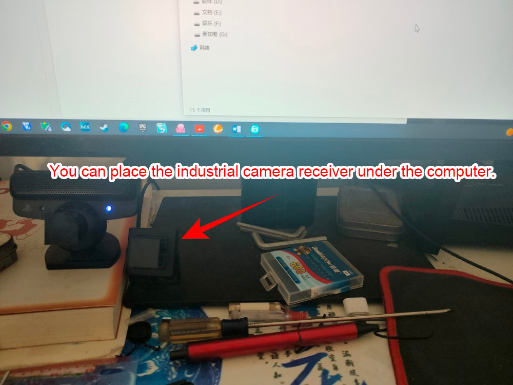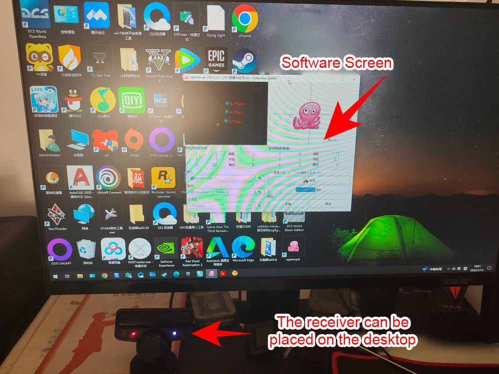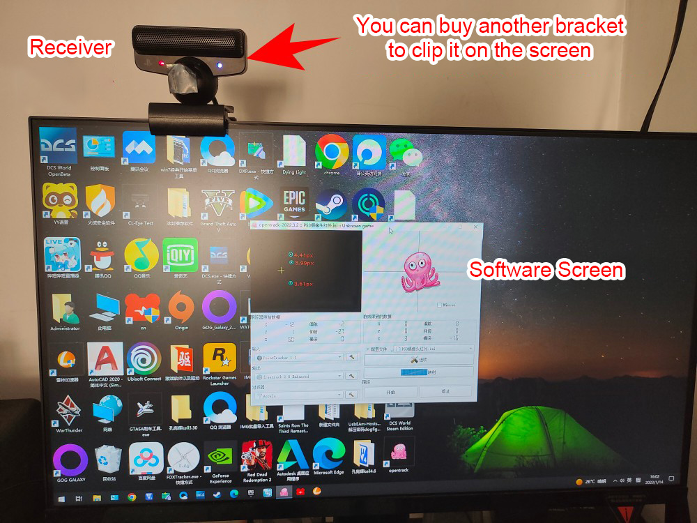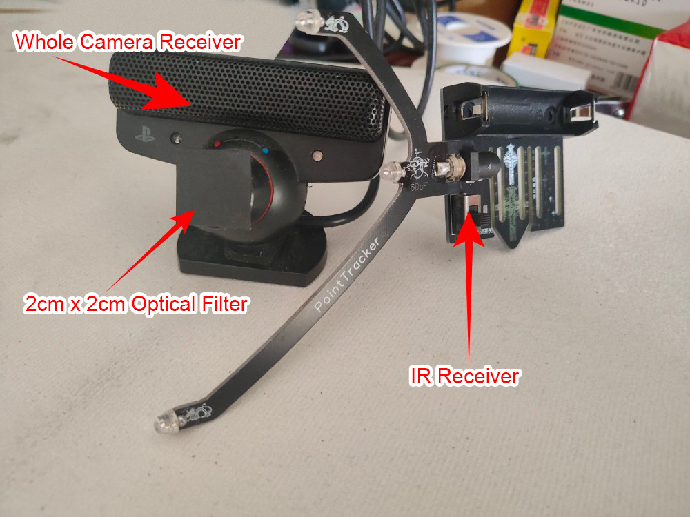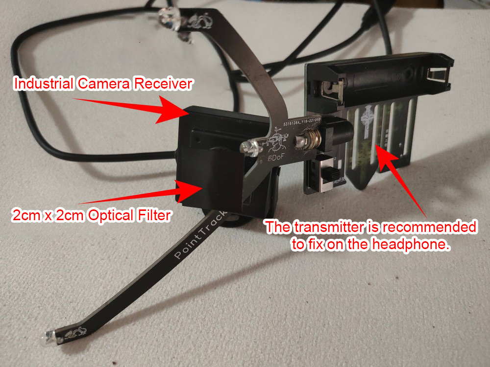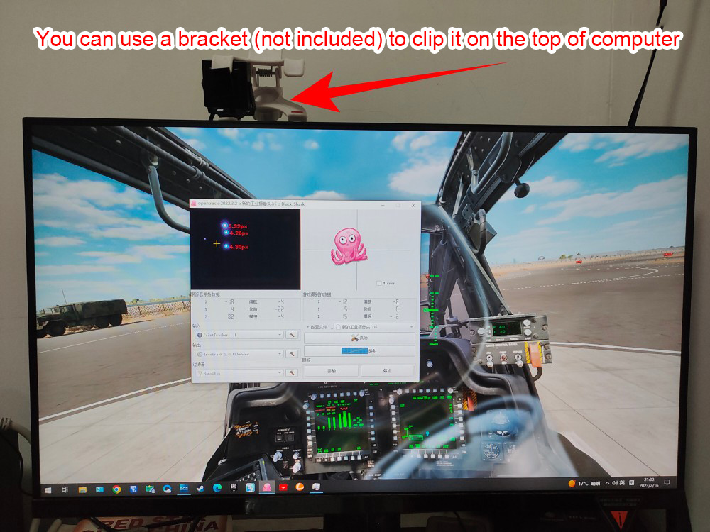 - The camera can be placed on the desktop or on the screen with a bracket (not included). The front of the camera is covered with a filter film to filter visible light, and the transmitter is worn on the head to emit infrared light for positioning. Earphones, hats, headbands, glasses, glasses legs should not be too thin.