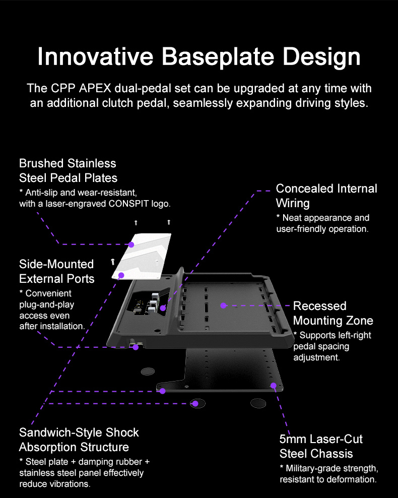 * The CPP APEX dual-pedal set can be upgraded at any time with an additional clutch pedal, seamlessly expanding driving styles.