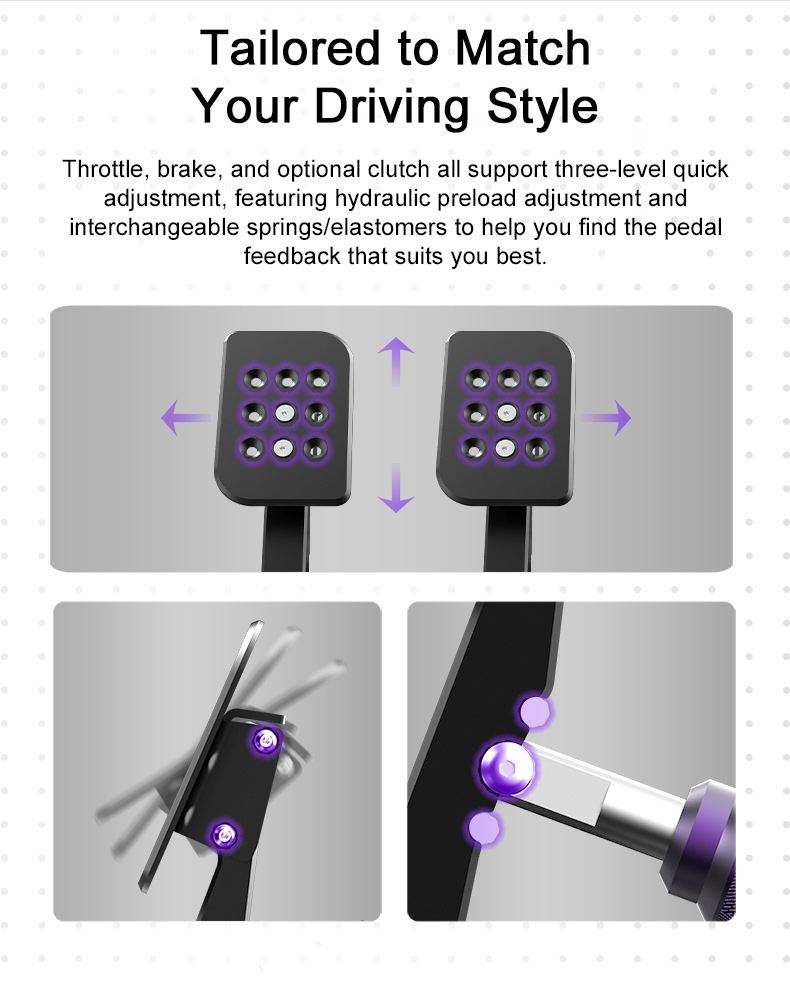 * Throttle, brake, and optional clutch all support three-level quick adjustment, featuring hydraulic preload adjustment and interchangeable springs/elastomers to help you find the pedal feedback that suits you best.