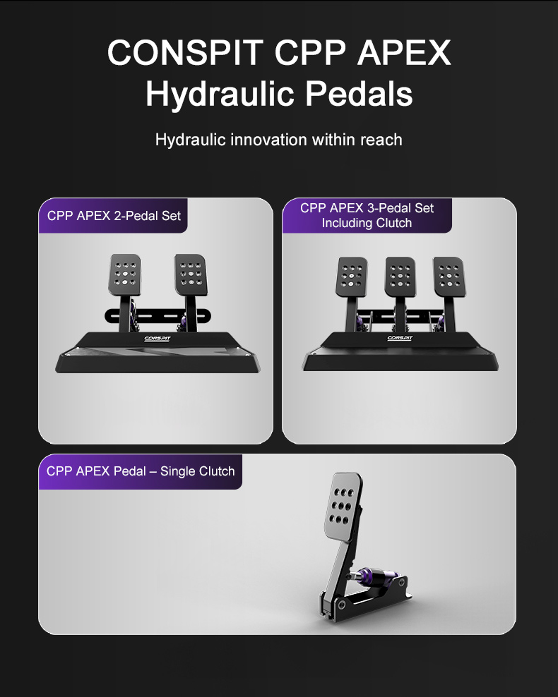 * The CPP APEX hydraulic brake pedal set integrates CONSPIT's patented sensing technology with a hydraulic system to achieve precise control and deliver a realistic pedal feel.