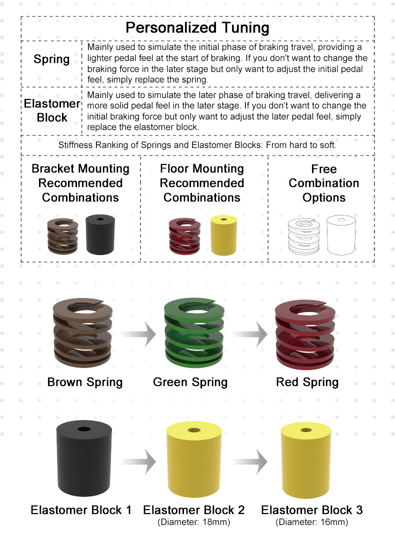 * The spring simulates the initial brake contact, while the elastomer provides solid feedback in the later stage. It supports swapping different hardness combinations for personalized tuning.