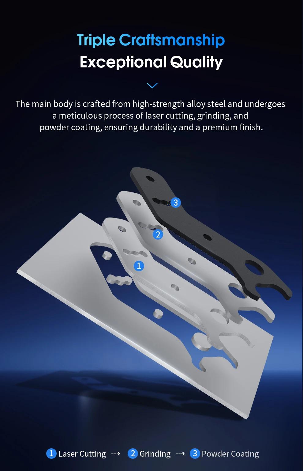 - High-Strength Alloy Steel Body: The whole body uses high-strength alloy steel with laser cutting, grinding, wire drawing, electrophoresis, and other processes. It is wear-resistant, sturdy, and durable.