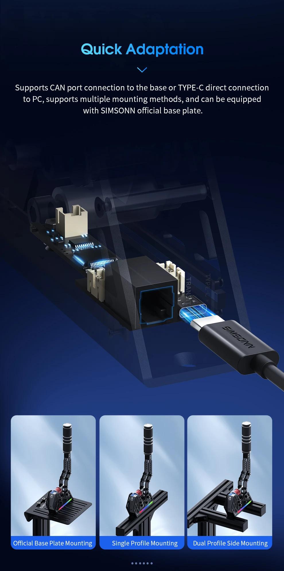 - Direct Connection to the PC or Wheelbase: The SIMSONN HB handbrake can be connected via CAN port to a wheelbase or Type-C directly to a PC, providing low latency and highly stable data transmission.