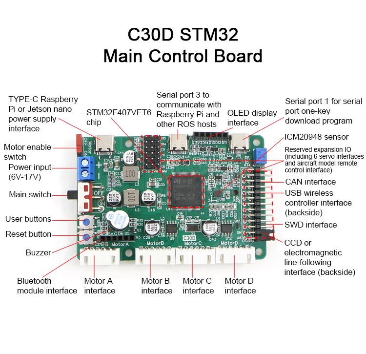 * Reserved Servo Interfaces: 6 servo interfaces reserved (can connect a 6DOF robotic arm)