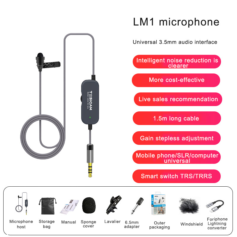 1.5M/4.9FT LM1 Collar Mic Collar Microphone w/ Conversion Cable For iPhone Noise Reduction