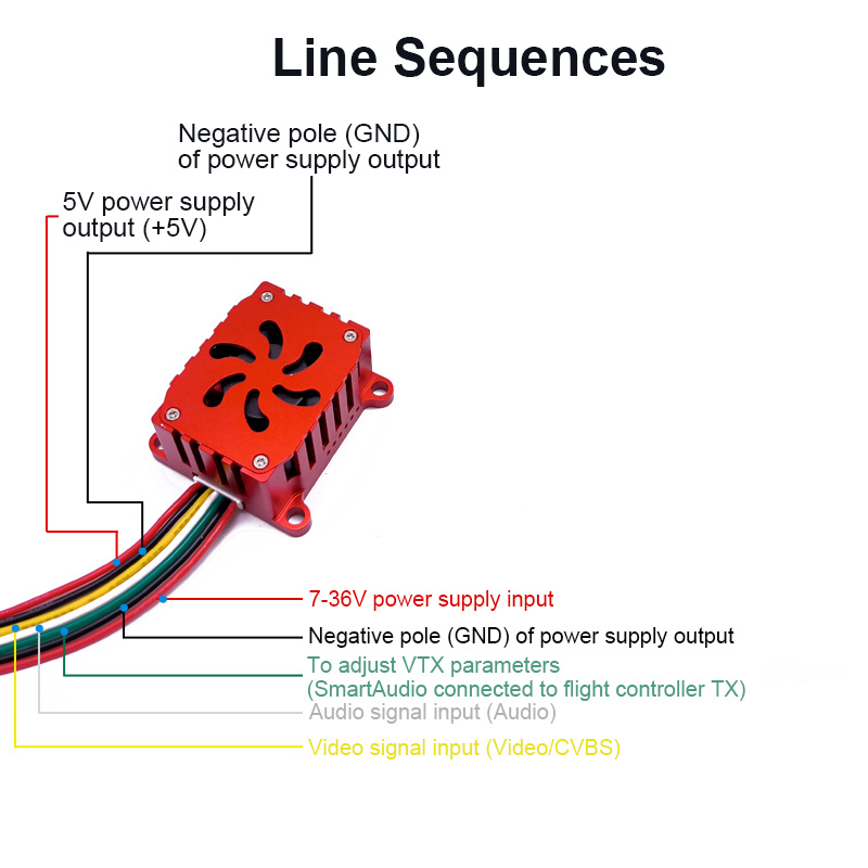 Answer: The single VTX transmitter needs to be wired. Please connect the wires according to the wiring sequence in the detailed diagram to avoid wrong connection and burning the transmitter.