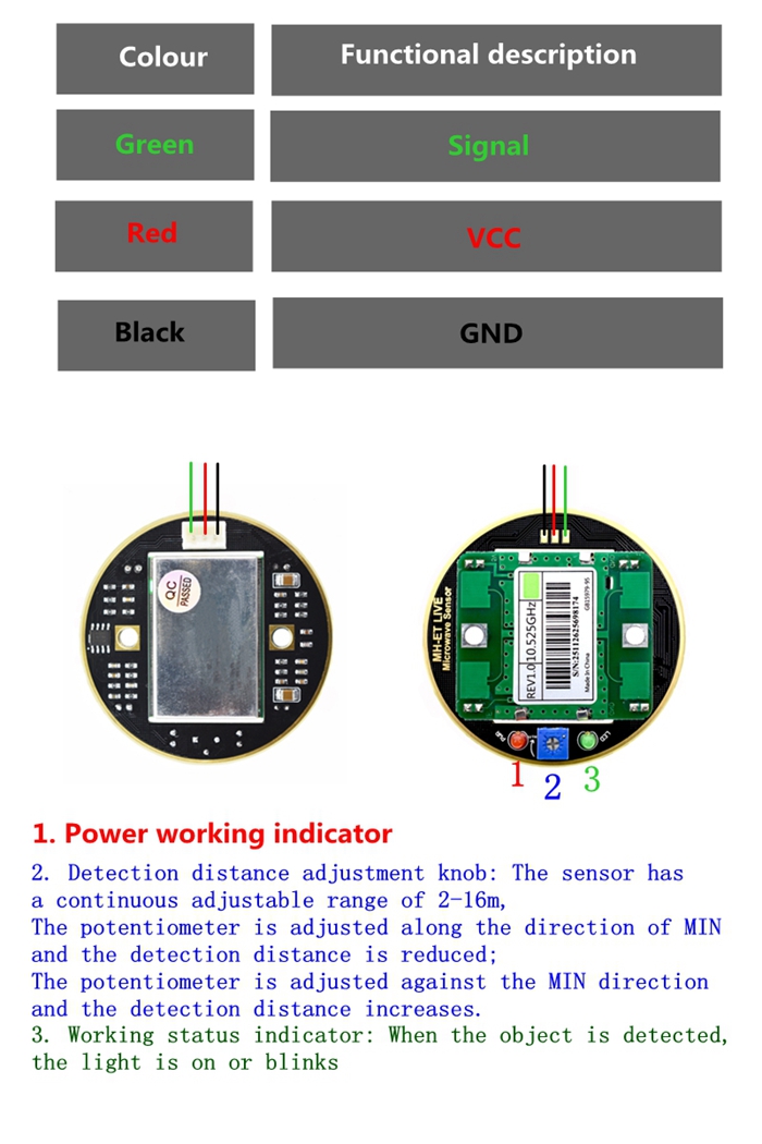 Note: The sensor has a continuous adjustable range of 2-16m, the potentiometer is adjusted along the MIN direction, the detection distance is reduced; the potentiometer is adjusted against the MIN direction, and the detection distance increases.