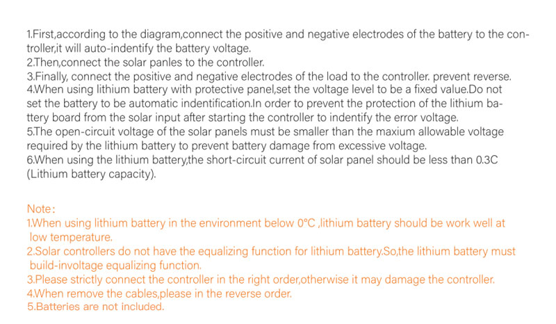- Solar controllers can be work from the solar panel when the voltage of lithium battery is 0V