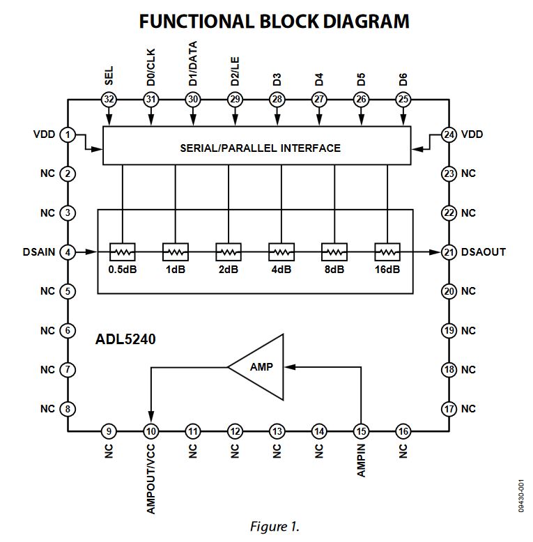 The ADL5240 is a high performance, digitally controlled variable gain amplifier (VGA) operating from 100 MHz to 4000 MHz. The VGA integrates a high performance, 20 dB gain, internally matched amplifier (AM P) with a 6-bit digital step attenuator (DSA) that has a gain control range of 31.5 dB in 0.5 dB steps with ±0.25 dB step accuracy. The attenuation of the DSA can be controlled using a serial or parallel interface.Both the gain block and DSA are internally matched to 50 Ω at their inputs and outputs and are separately biased. The separate bias allows all or part of the ADL5240 to be used, which facilitates easy reuse throughout a design. The pin out of the ADL5240 also enables either the gain block or DSA to be first, giving the VGA maximum flexibility in a signal chain. The ADL5240 consumes just 93 mA and operates from a single supply ranging from 4.75 V to 5.25V. The VGA is packaged in a thermally efficient, 5 mm × 5 mm, 32-lead LFCSP and is fully specified for operation from −40°C to +85°C. A fully populated evaluation board is available.