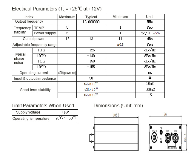The RVOSC-10000 OCXO module has a 10MHz OCXO with high stability as its main component. It outputs a 10MHz sine wave signal with an amplitude of 12dBm. Its typical harmonic distortion is ≤ -40dBC.