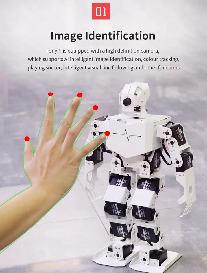 TonyPi intelligent visual humanoid robot uses Raspberry PI as the central controller. OpenCV is the image processing library, which uses Python language programming. The robot is equipped with a 2-DOF high-definition camera, which is able to realize Al image identification, colour recognition, playing soccer, visual line following and other gameplay. It equipped with high-voltage bus servo and voltage display. Large capacity significantly increases the working time and built-in action group make it possible for humanoid robot do much complex motion like push-ups.