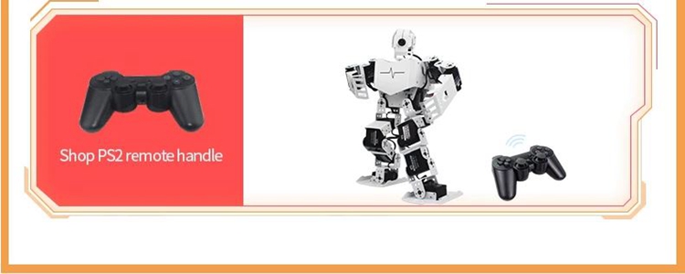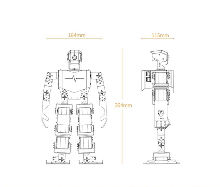 - 18DOF: 2DOF Head + 2DOF Shoulder + 2DOF x 2 Arms + 4DOF x 2 Legs + 1DOF x 2 Feet