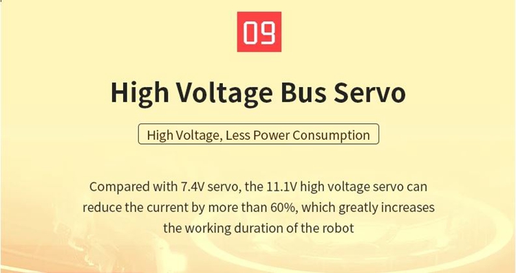 - High Voltage Bus Servo: Compared with 7.4V servo, the 11.1V high voltage servo can reduce the current by more than 60%.
