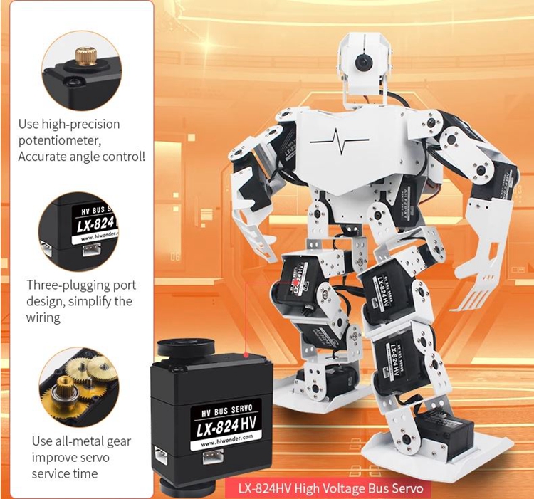 - The robot features LX-824HV bus servo and fast kinematics algorithm.