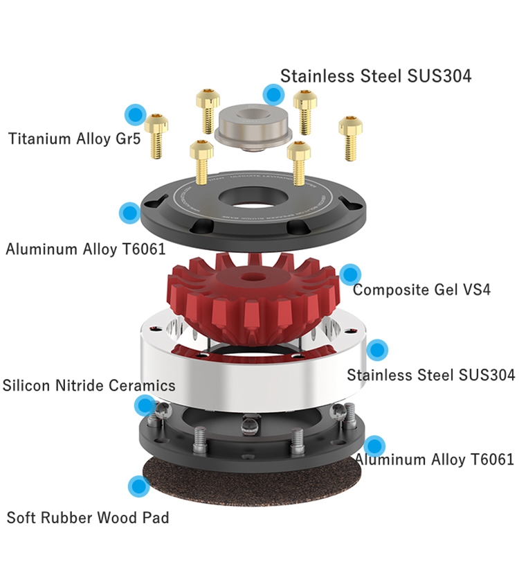 - Titanium alloy GR5, stainless steel SUS304, silicone cushion layer & aluminum base