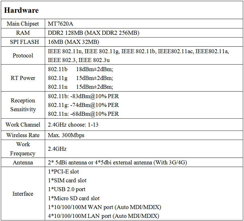 The WE826-T2 uses the latest wireless solution, performs better and more function. Stable wireless performance, more functions , 2.4G 300Mbps, Also support 3G, 4G (3G, 4G PCIE module is necessary), it could also dial-up via the USB port (should mount the 3G,4G network card). Provide 1 USB2.0 interface, 1 Micro slot.