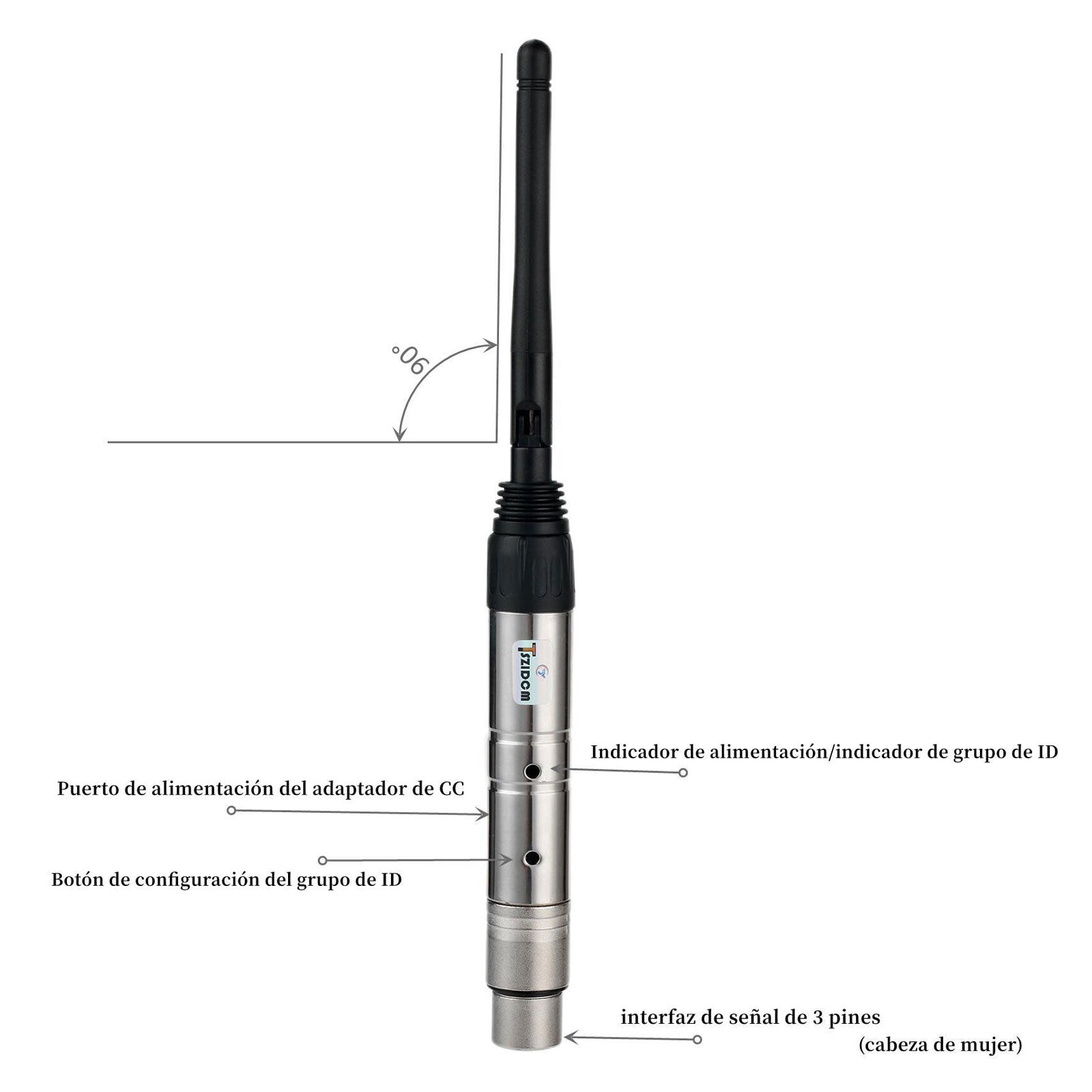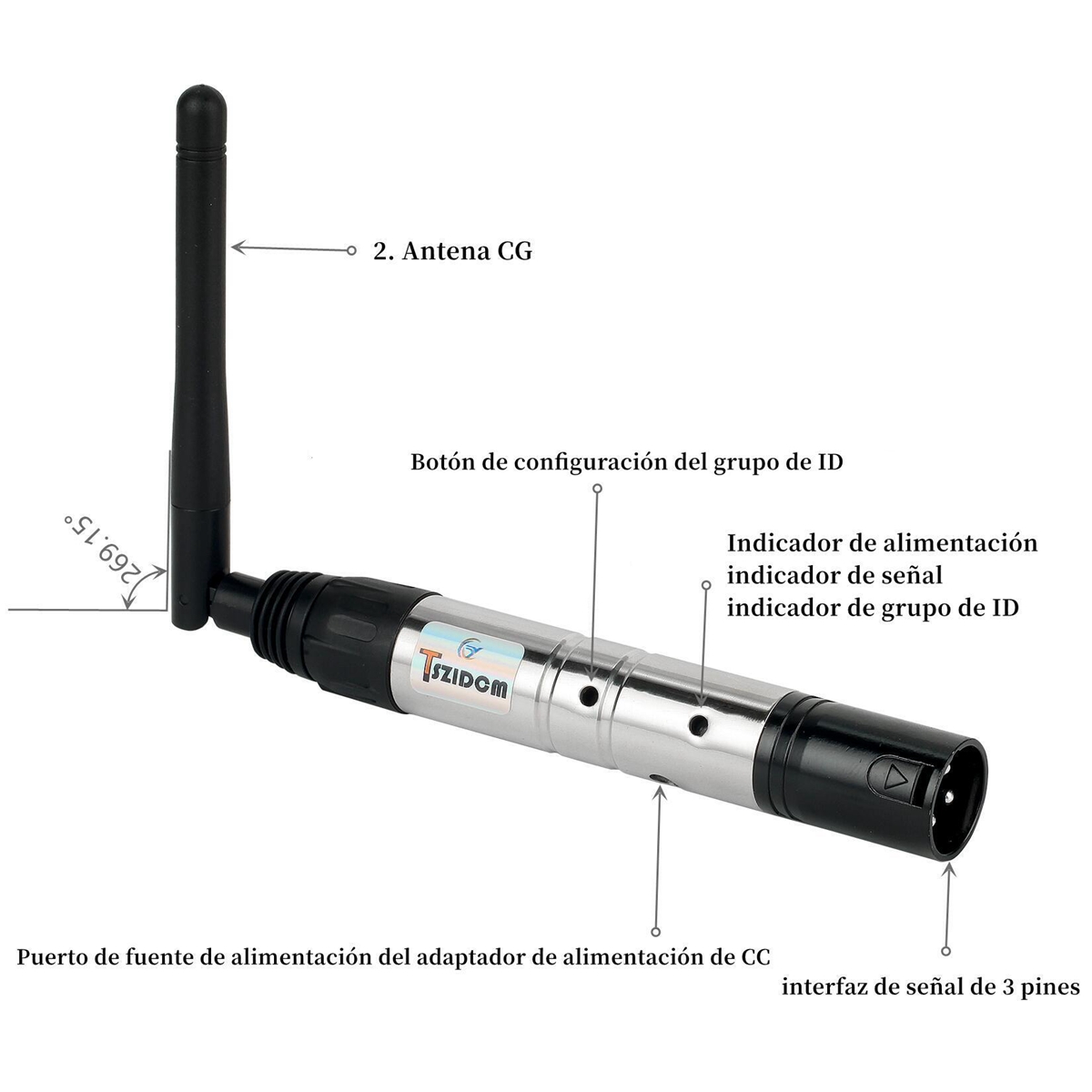 - The transmitter is connected to the control console, and the receiver is connected to the lighting. One transmitter can control 512 channels of lighting.