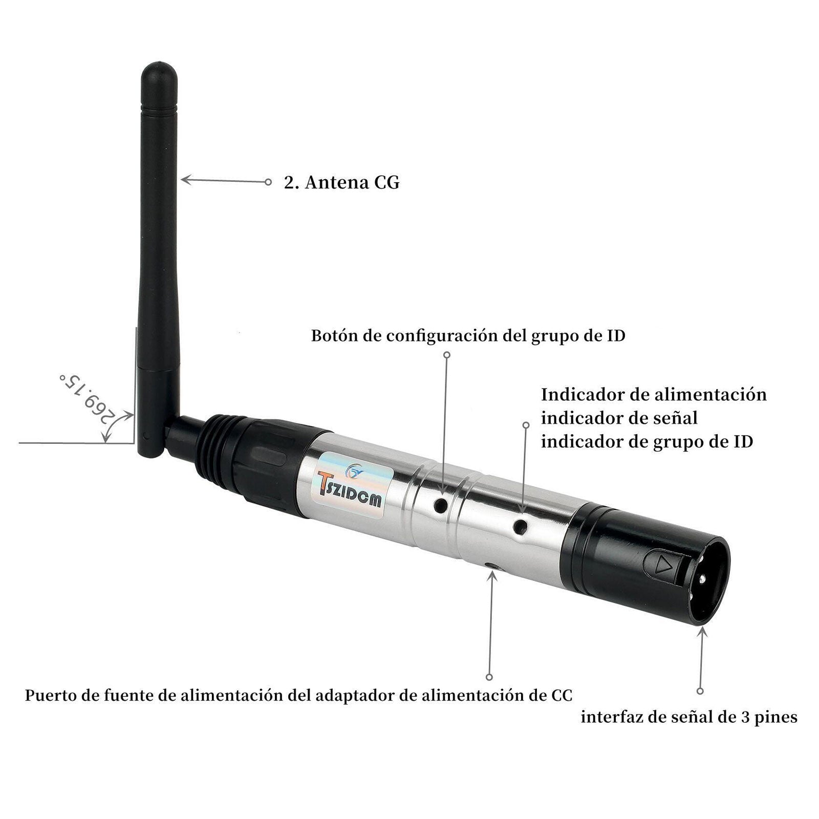 - The transmitter is connected to the control console, and the receiver is connected to the lighting. One transmitter can control 512 channels of lighting.