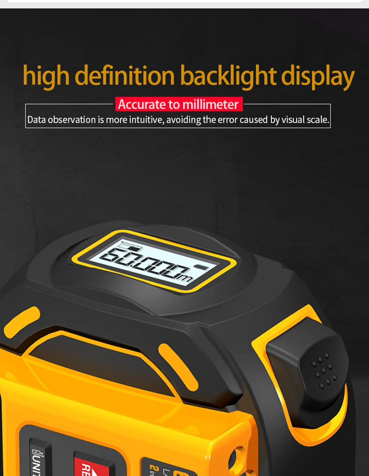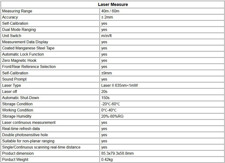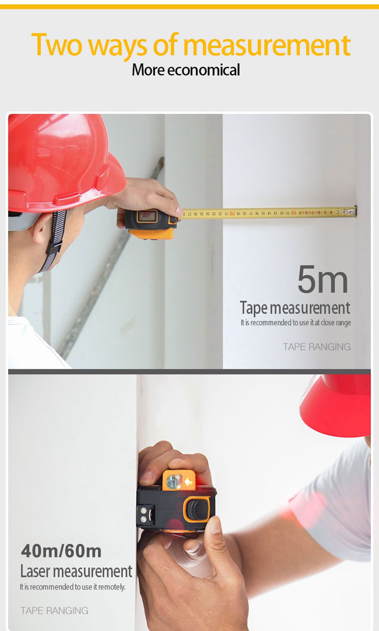 - Dual Mode Ranging: laser meter 40m/60m and tape measure 5m
