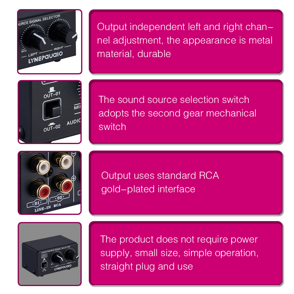 2. This product is mainly used to select a common output device for switching various stereo signal input. If there are two stereo signal sources (such as TV audio, MP3 player, CD player, video game, mobile phone, tablet, computer, record player), the device needs to output to the power amplifier or active speaker.