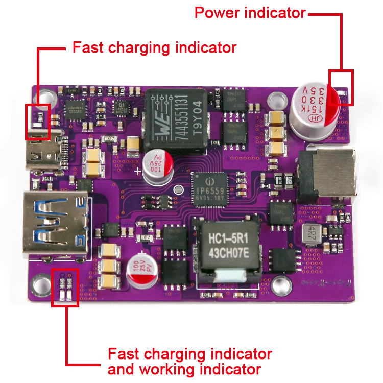 TPH3R704PL MOSFETs of the product, imported from the United States, are one of the best MOSFETs we have ever used. They greatly reduce heat generation and improves efficiency. The module also adopts a new imported inductor. There are multiple LEDs on the product, namely the power indicator at the rear, the fast charging indicator next to the C port on the left, and the IP6559 working indicator and fast charging indicator on the right.