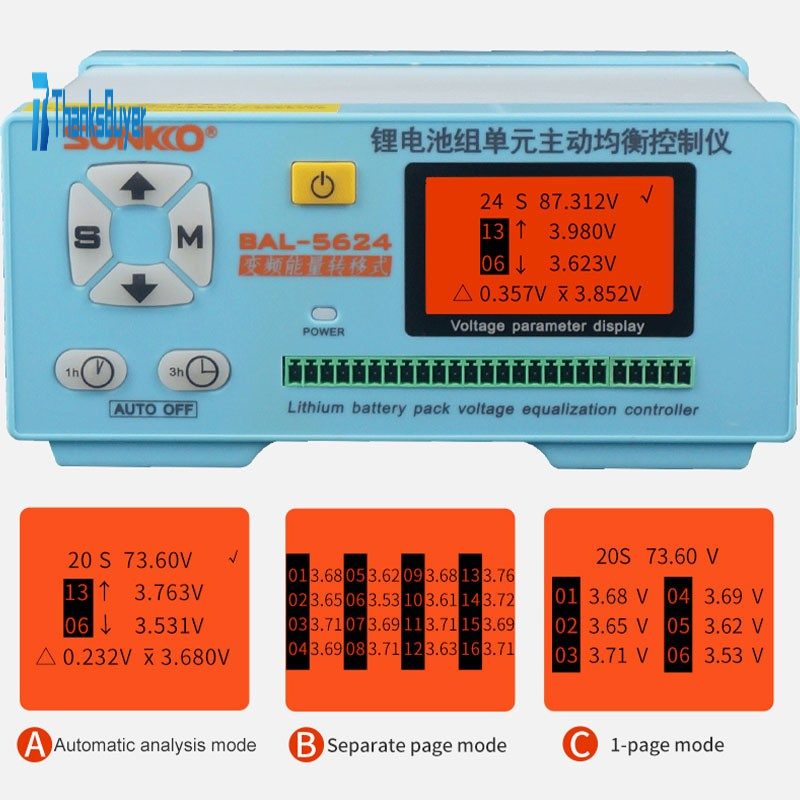 - And the analyzer adopts latest large-scale high-speed MCU chip of American microchip to carry out real-time precision detection of each unit of lithium battery pack. The voltage information collected by the chip is stored and calculated and compared, and the data is processed and displayed on the LCD screen. This detector can detect the voltage of up to 16 series of lithium batteries at the same time, and automatically analyze and compare the voltage. For real-time monitoring equalizing voltage, it is suitable for high-capacity ternary lithium battery pack and lithium iron phosphate battery pack, etc. The maximum equalizing current can reach 5A, and the equalizing voltage difference can reach 30mV; Forced start switch is added to better solve the problem of poor equalization effect.