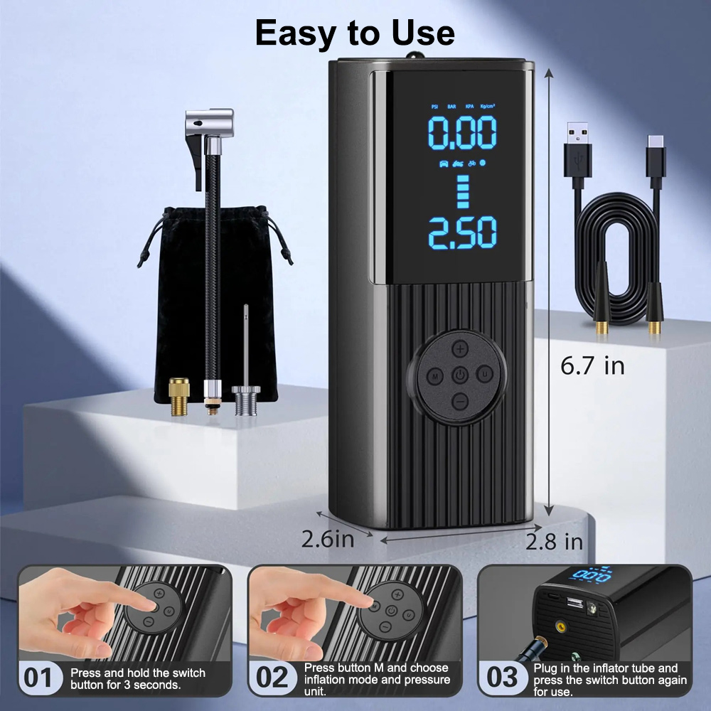 - Portable Design: The cordless tire inflator adopts a compact cordless design and is compact in size. It is equipped with a storage bag for easy storage in cars, bike racks and backpacks. It is very suitable for inflating during travel or at home. The cordless tire inflator includes multiple accessories and it is a must-have product for drivers, cyclists and adventurers.