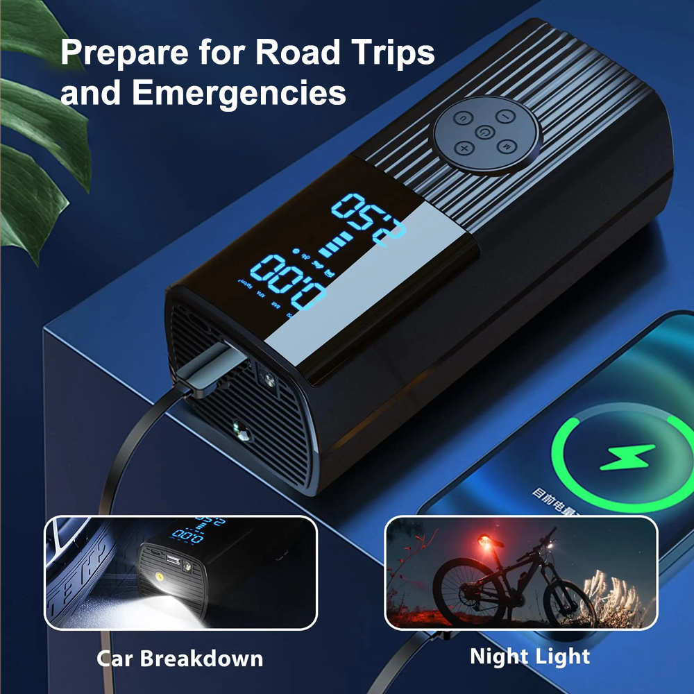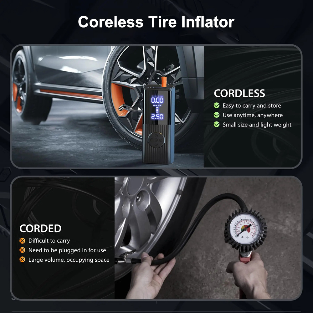 - Persistent Power Tire Inflator: This tire inflator comes with a built-in rechargeable battery for power supply, eliminating the need to connect to an external power source during use. The inflation speed is three times faster than other ordinary cordless inflators on the market, with a 35% increase in power. It can inflate 12 car tires or 30 racing bicycle tires, away from the problem of low power.