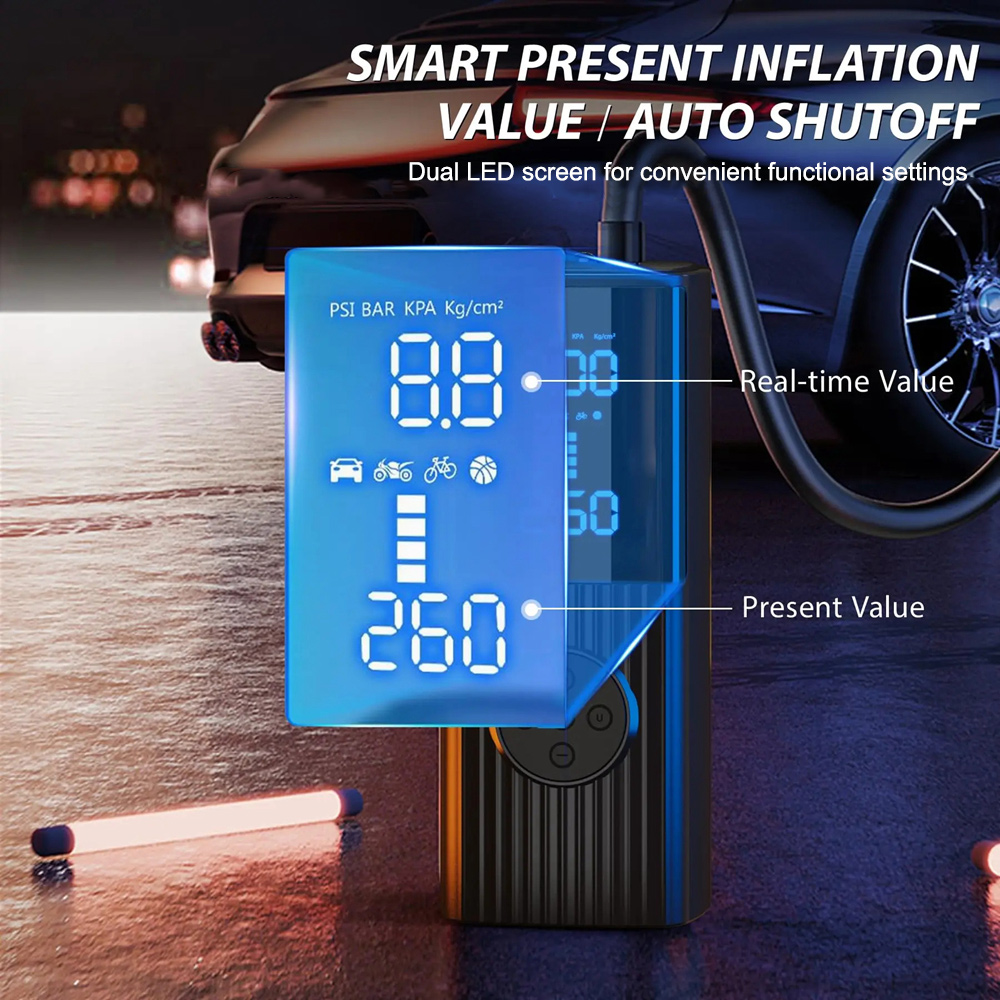 - Dual Screen Display: With built in high-performance chip, the portable tire pump can quickly inflate tires and provide high-speed air flow. Inflate small car tires in less than 1 minute. The large-sized LED screen displays real-time pressure values and preset values, making it easy to monitor tire pressure. The automatic shutdown design can also prevent excessive inflation, making it safe to use.