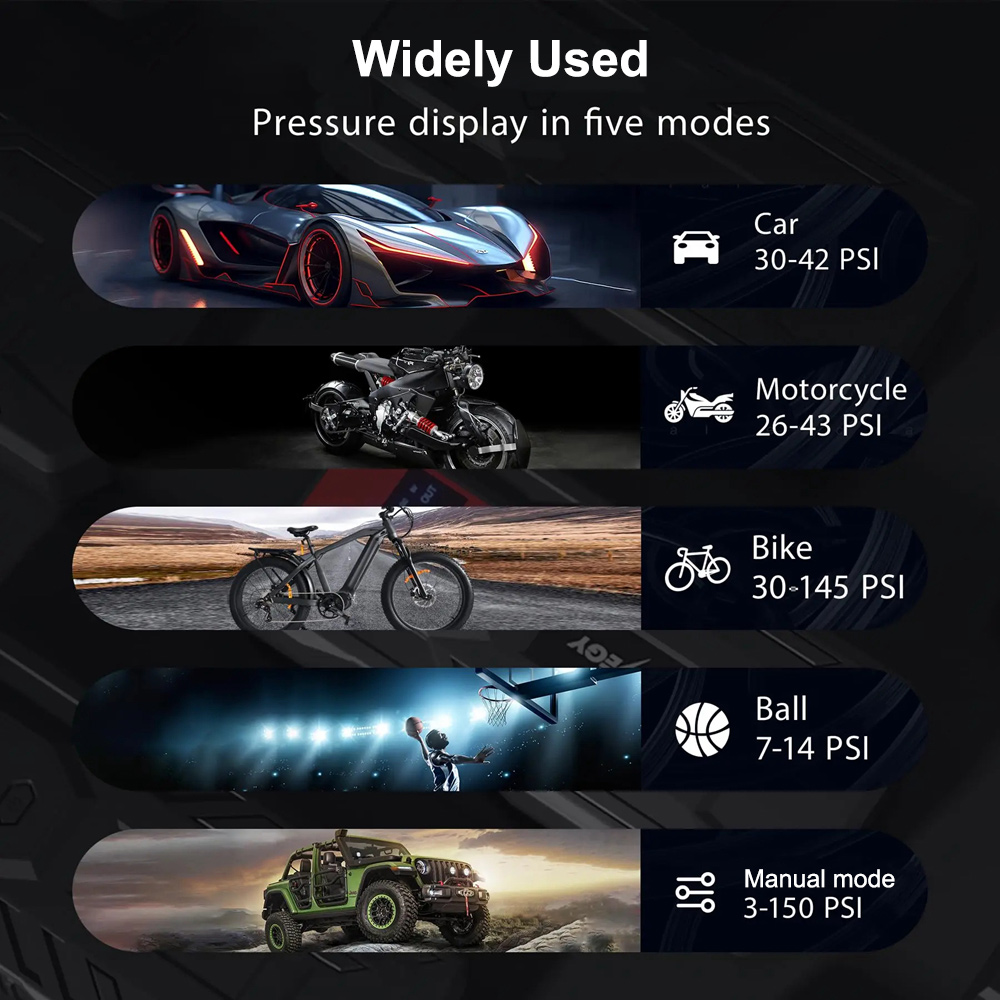 - 4+N Inflation Modes: The air compressor has four types of pressure units: PSI, KPA, BAR, and KG/CM ². There are four preset inflation modes: bicycle, motorcycle, car and ball. The fifth custom mode can also set pressure values based on the inflation object to meet various inflation needs. It is an essential product for daily life and travel.
