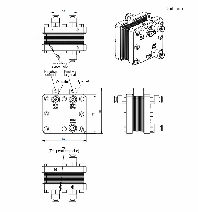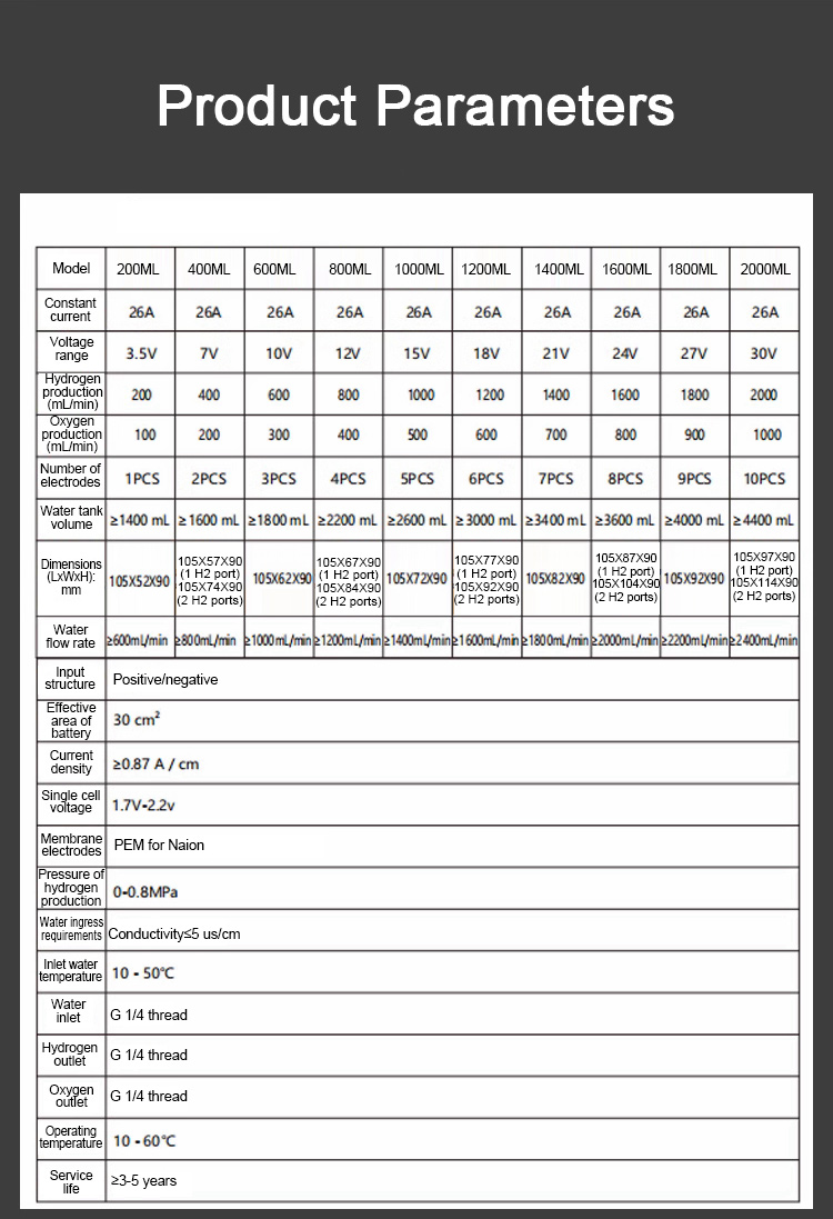 - It adopts aluminum alloy outer end plate, food-grade silicone seal, titanium material accessories, and PEM (for Nafion) electrodes encapsulated inside