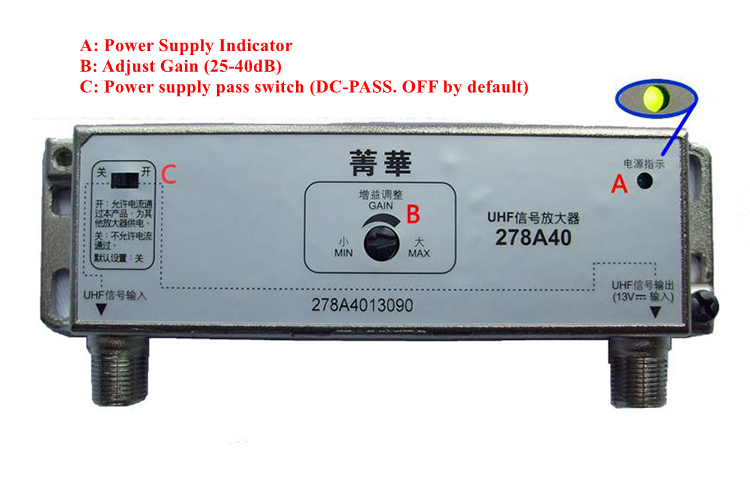 3. A UHF amplifier with DC PASS function especially suitable for remote receiving or building multi-user receiving