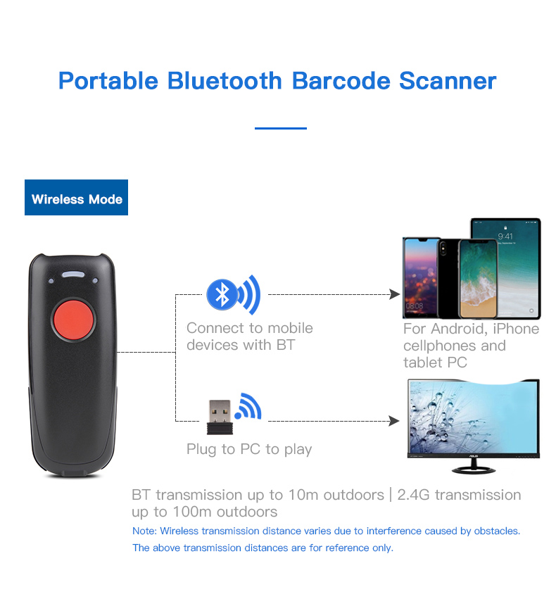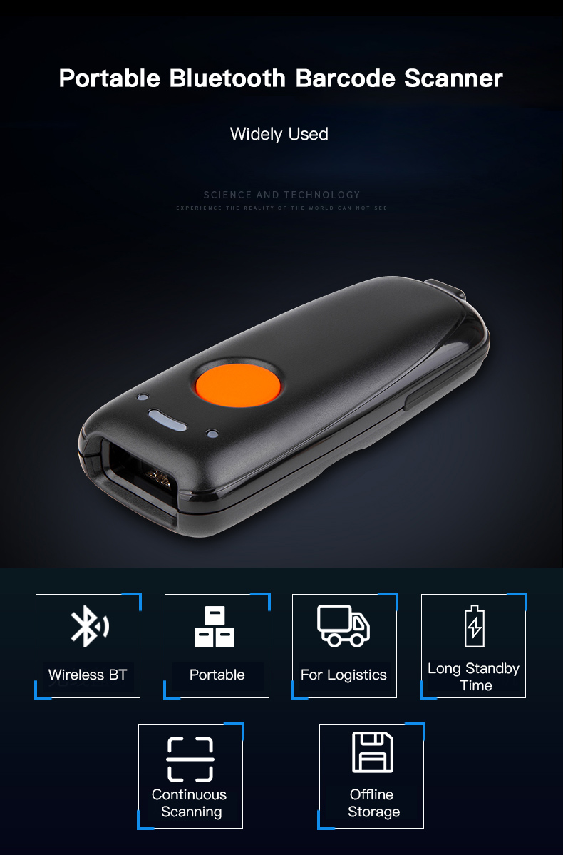 The Wireless Bluetooth Barcode Scanner has a strong scanning light source and enhanced long-range scanning technology which makes it possible for fast reading and for long distance reading for damage, dirty and poor print quality bar codes. Durable and stable advantages for industrial grade protection. High-volume buzzer makes the scanner work well in the noisy industrial environment which adds the confirmation needs for scanning besides LED.