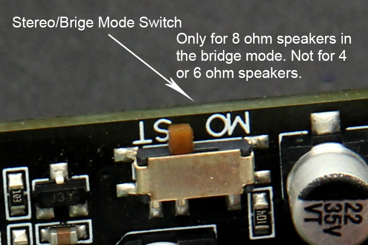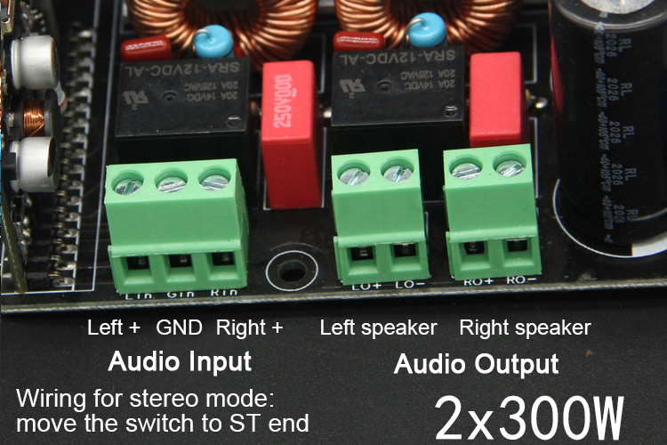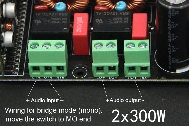 The board is a stereo one, and it can also be bridged into mono mode. When it is used as a stereo board, the switch on the board is dialed to ST, and when it is bridged, it is dialed to MO, and the specific wiring is as follows: