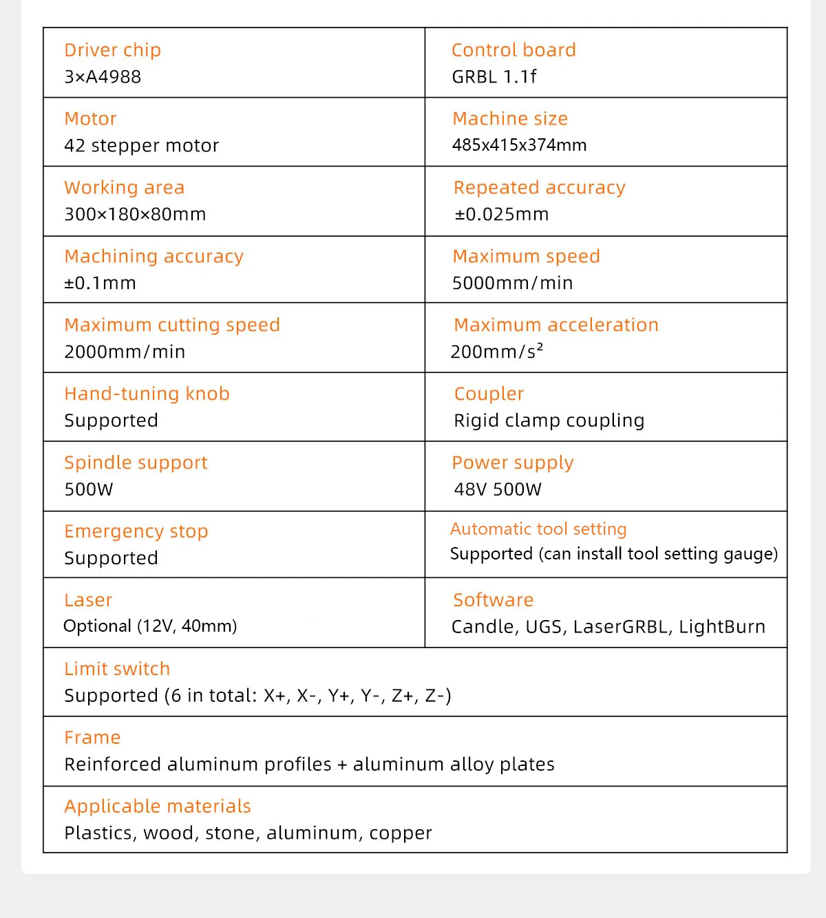 - High Speed CNC Router Machine with 500W Spindle: The 500w Spindle is a Robust and Versatile Component Design. Its High-power Output Enables It to Deliver Consistent Performance, Even When Cutting Through Dense Materials Like Aluminum and Copper. This Powerful Spindle Ensures That Your Machine can Tackle Even The Most Demanding Projects While Maintaining Precision And Efficiency. The Maximum Movement Speed can Reach 5000mm/Min. The Spindle Speed Range is 0-12000RPM/Min.
