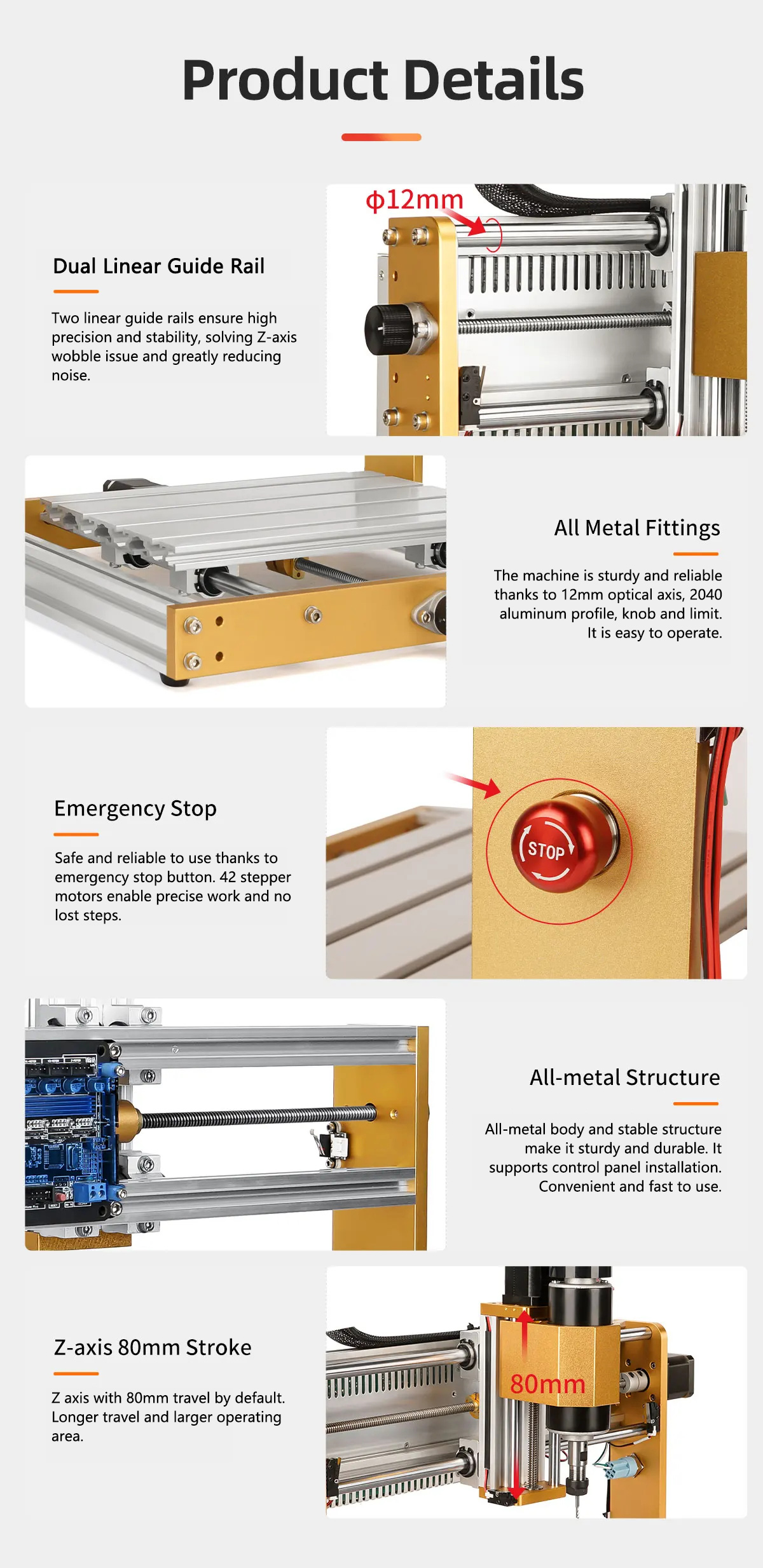 - Extra Long Z-Axis Travel: The New Design Makes This Machine Have The Longest Z-axis Stroke Among (80mm/3.1") The Standard Models on The Market. Additionally, Our Machine Frame Incorporates a 12mm/0.5" Optical Axis, Which Provides Precise Linear Motion and Accurate Positioning. This Feature is Crucial For Maintaining The Performance and Efficiency of Various Machinery and Automated Systems. We Provide Dedicated Upgrade Kit for 12mm/0.5", Please Contact us if Necessary (Upgrade Kit is Sold Separately).