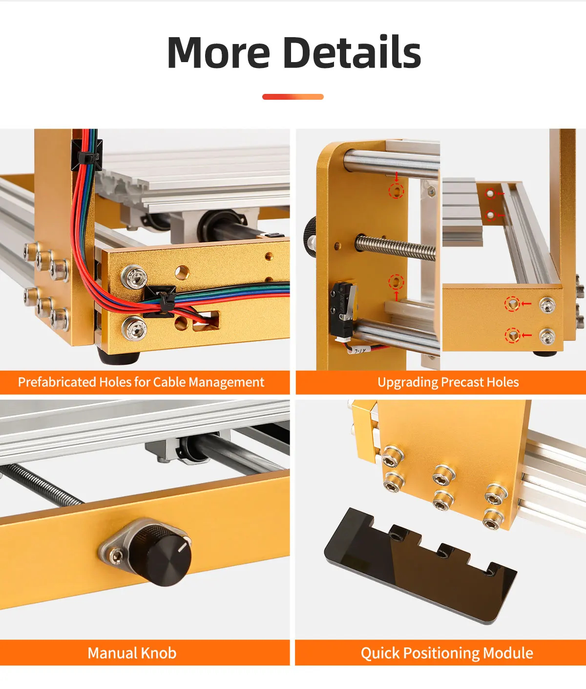 - All Metal Structure: The All-metal Construction Has Durability, Stability and Reliability. By Using Reinforced Aluminum Profiles, The Machine Frame can Withstand Heavy Loads and Resist Wear And Tear Over Time. Furthermore, No Plastic Parts (Except For Electrical Components) Ensures That The Frame Maintains Its Structural Integrity Even in Harsh Operating Conditions.