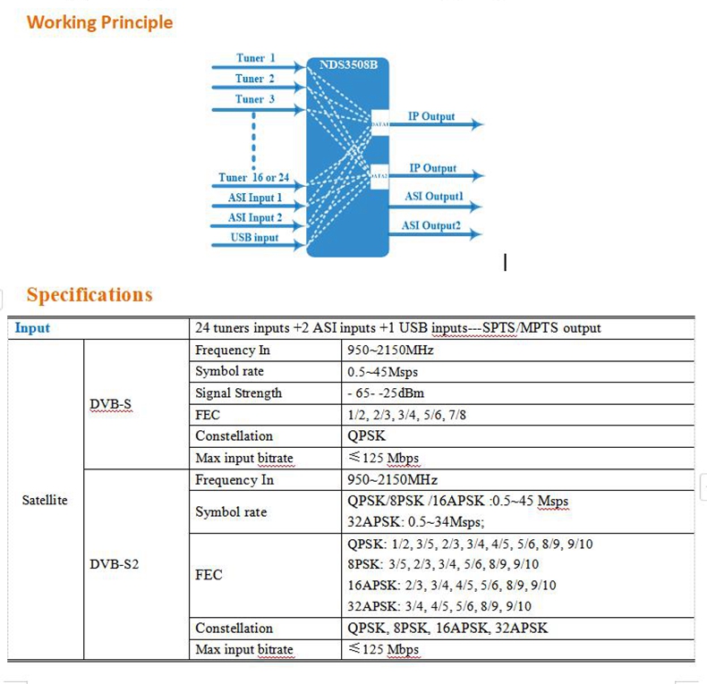 - 3508B Tuner to IP Gateway is a head-end interface-conversion device which supports MPTS and SPTS output switchable in Web GUI. It supports 24 MPTS + 3 MPTS (2 ASI inputs and 1 USB input) or 1024 SPTS output over UDP and RTP/RTSP protocol. It is integrated with tuner demodulation (or ASI input) and gateway function, which can demodulate the signal from 24 FTA tuners into IP package, or directly convert the TS from ASI inputs or USB input into IP package, then output the IP package through different IP address and ports. BISS function is also embedded for tuner inputs to descramble the programs from tuner inputs.