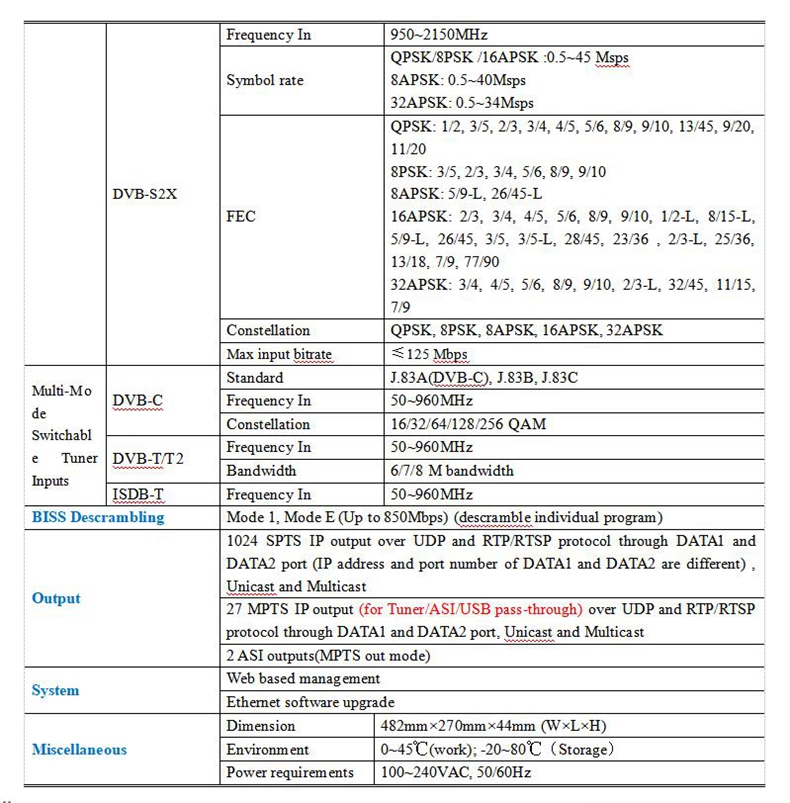 - Support 24 or 16 FTA DVB- S/S2/S2X or DVB-C/T/T2/ISDB-T Multi-Mode Switchable tuner inputs, 2 ASI inputs, 1USB input (TS file Playing, FTA 32, USB 2.0)