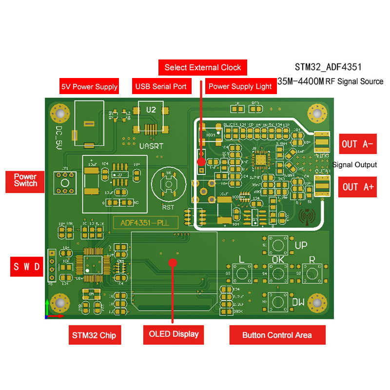 For the ADF4351 ADF4350 integrated phase-locked loop, this phase-locked loop module with OLED display, host computer USB & serial port, integrated button operation, wide-range voltage power supply, and good human-computer interaction interface is introduced. The module can achieve 35MHz-4.4GHz frequency output, basic functions such as dot frequency, sweep frequency, and frequency hopping.
