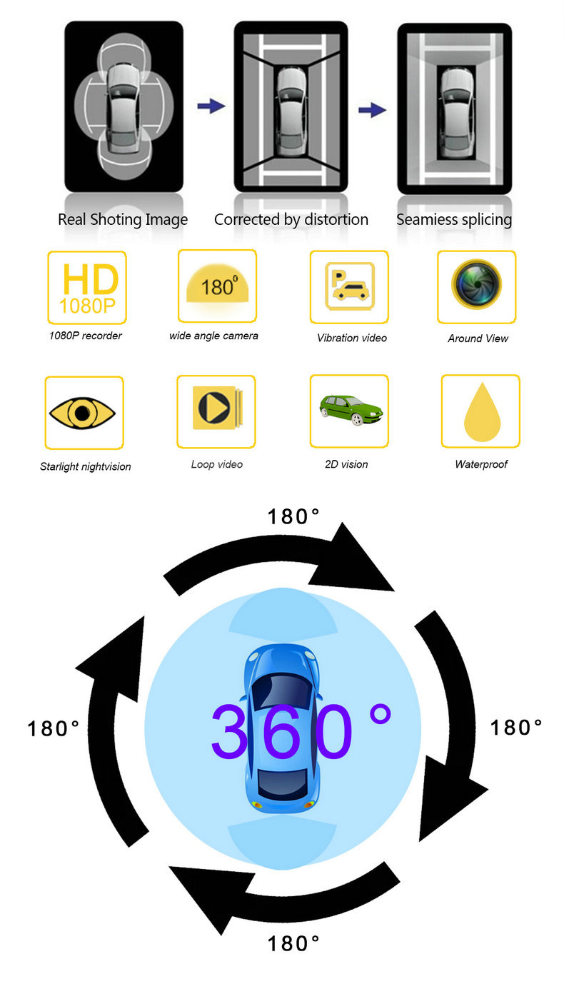 - 360 panoramic bird's eye view, seamless mosaic & no blind area on the ground