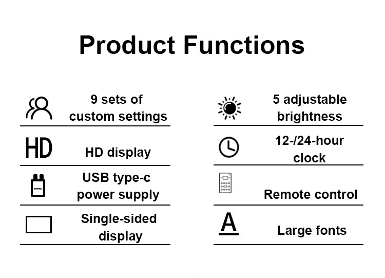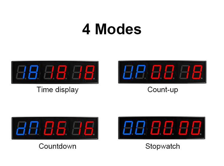 - Count-up mode: It starts from 00:00:00. Start, pause and reset can be controlled by an IR remote control.