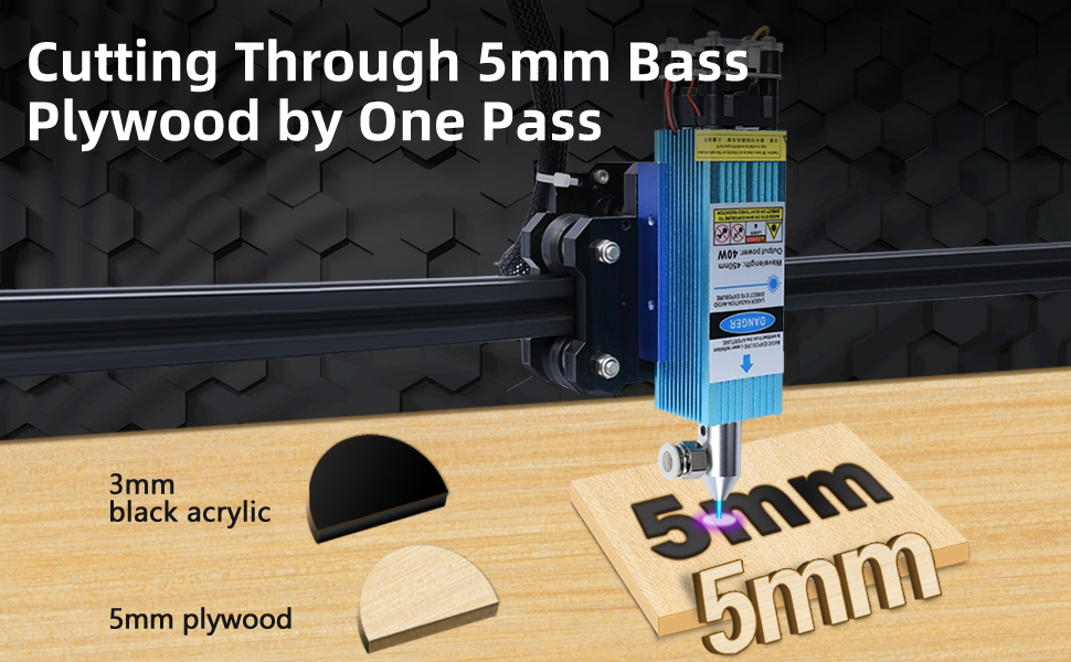 - Laser Engraver Module: The laser module has a machine power of 40W and an output laser power of 5.5W. The 5.5W laser cutting module can cut through 5mm plywood and 3mm black acrylic with one pass. It has excellent compatibility with 3D printers, 3018 series CNC engraving machines, laser engraving machines, laser cutting machines, and CNC routers.