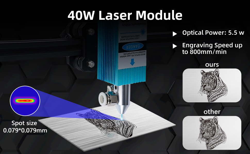 - Beam Compression Technology: The laser module adopts beam compression technology to reduce the focal area and improve resolution. Our engraving laser module uses high-quality original diodes with built-in FAC, which makes the beam size at the focus smaller, providing ultra-strong cutting penetration and accuracy. The power density is increased, and the engraving speed is correspondingly increased. At the same time, the accuracy is also increased.
