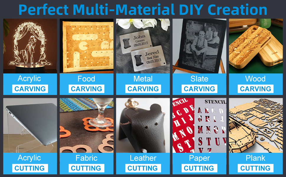 - Wide Compatibility and Use Applications: Compatible with laser engraving machines, laser cutting machines and CNC machines. Suitable for cutting and engraving materials such as pine board, wood, stone, bamboo, basswood, black acrylic, plywood, coated glass, lacquered metal, plastic, leather, aluminum oxide, ceramics and stainless steel.You can create exquisite Christmas cards, commercial signs, Models cutting, greeting cards, engraved drawings, etc. (Please note that engraving reflective materials requires the surface to be painted black.Unable to engrave transparent material and aluminum without oxide layer).