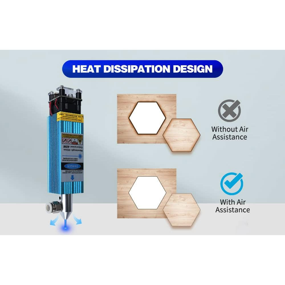 - Professional Air Assist and Heat Dissipation Design: Using air-assist, the 5.5W optical power laser module can make material edges cleaner and cut deeper when cutting. Air assistance can increase laser cutter efficiency to save time and enjoy concise beauty. The laser module has a built-in fan cooling system with a fan speed of 5000 rpm. Even after 30 minutes of 100% power output, the power decrease is only 300-400MW.
