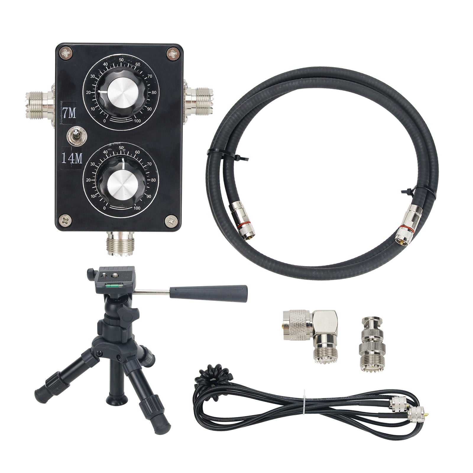 (BNC mount equipment needs to bring a pair of photography tripods) Use the right-angle adapter and double male docking to connect the antenna to the m seat at the rear of the radio station or erect the ring body to the connector on both sides of the controller and tighten, then install the tripod to the fastening seat on the back of the tuner Open the tripod, place the antenna body firmly on the tripod, and finally connect the feeder (the feeder is attached with a choke, one end of the choke is placed near the small loop antenna).