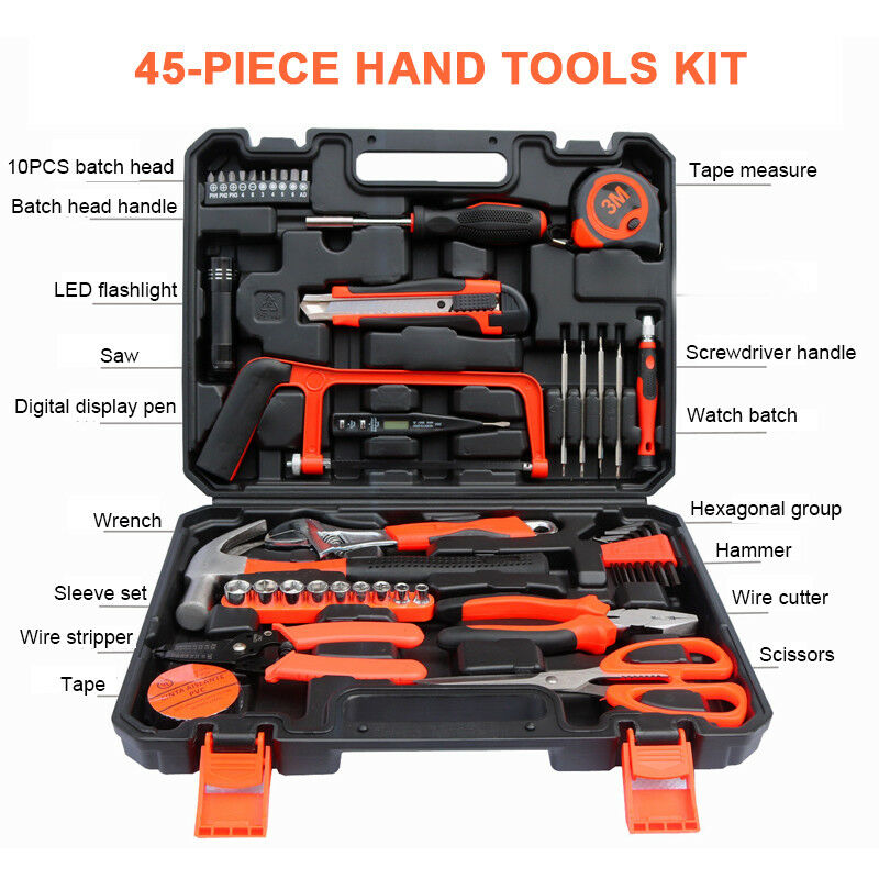 45 Pcs Home Repair Maintain DIY Car Household Hand Tool Kit Set Case Mechanics Box