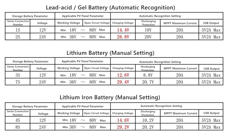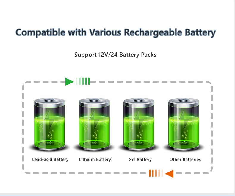 - Compatible battery: lead acid / lithium / gel battery, etc.